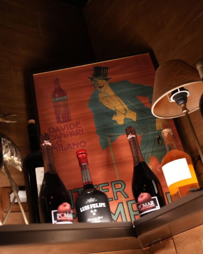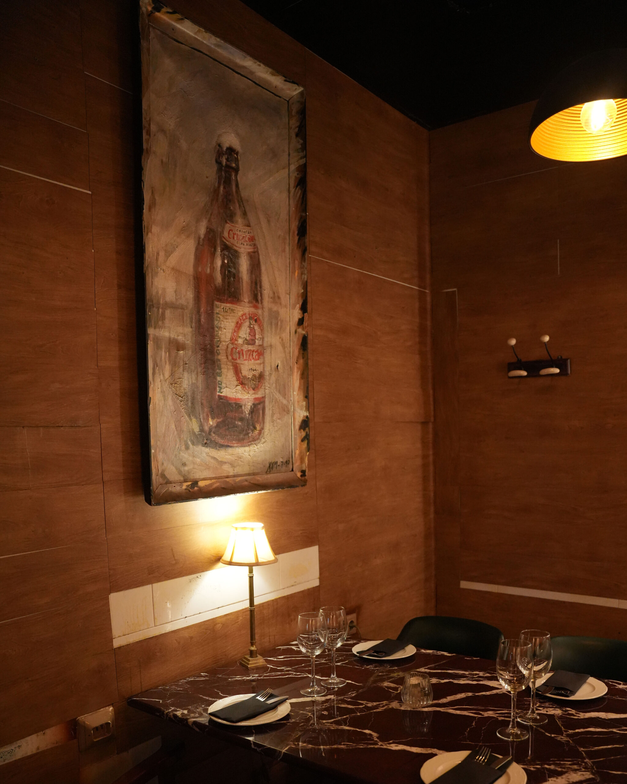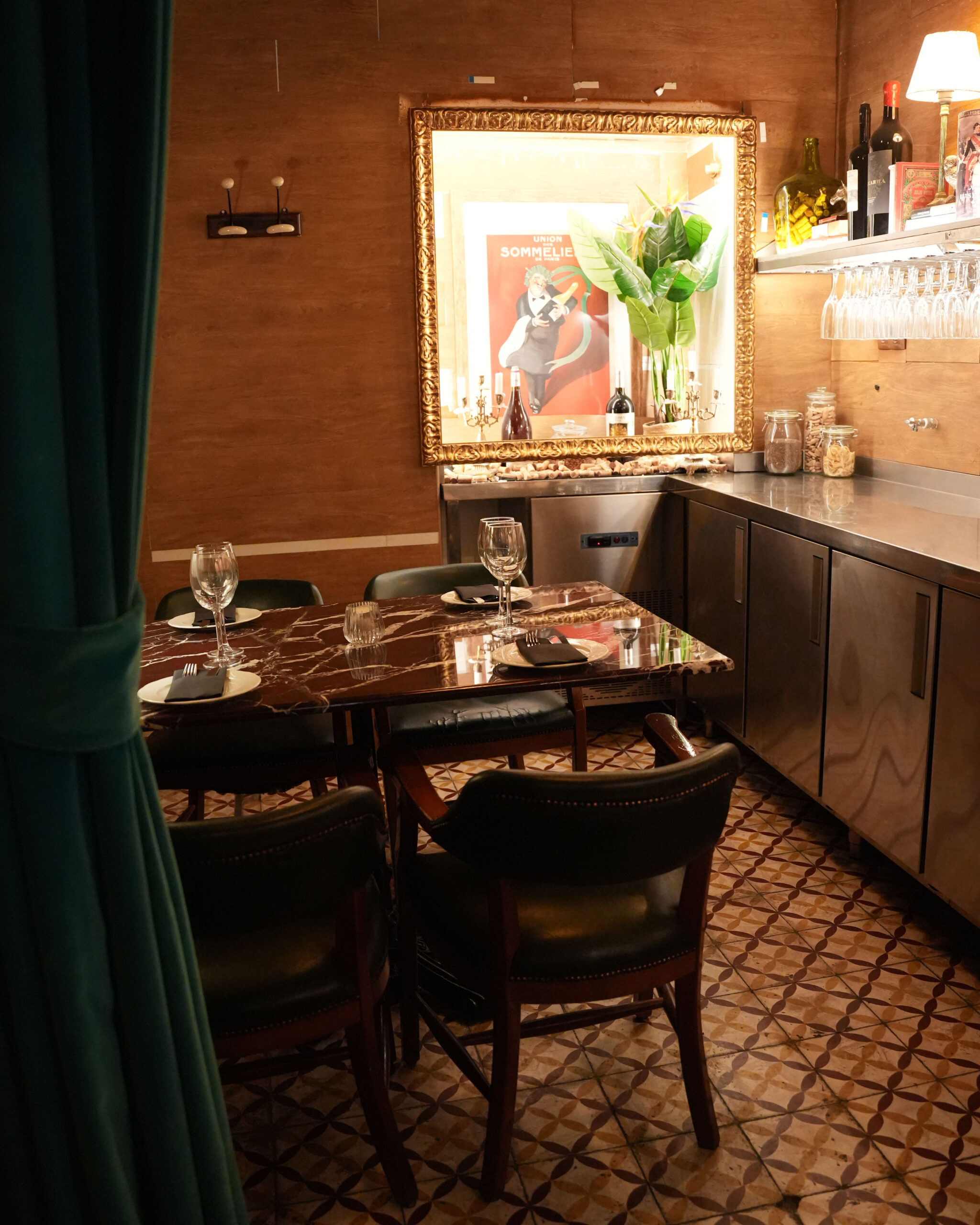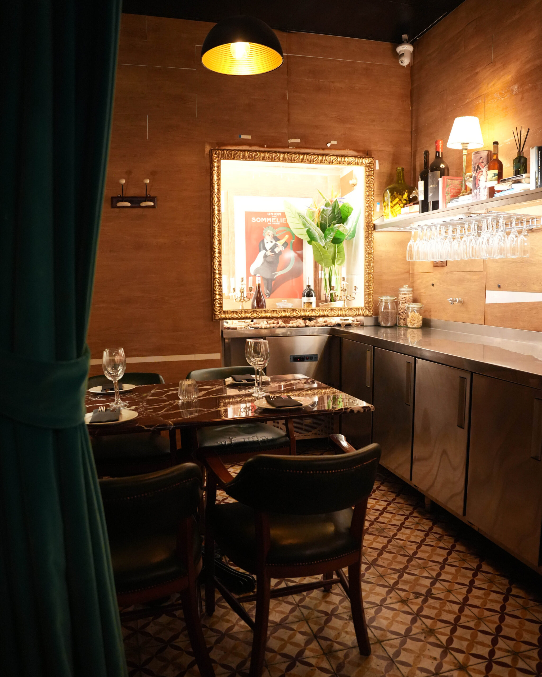 Entre pasillos, puertas y luces tenues está la Trastienda donde podrán disfrutar cuatro comensales en una mesa baja con cuatro cómodas sillas de un aperitivo, almuerzo o cena íntima entre vinos, raciones y buenas conversaciones.
